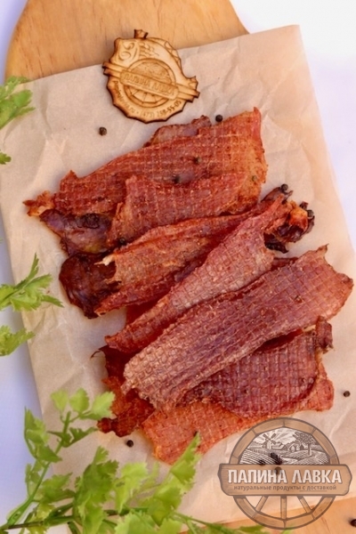 Состав: мясо свинина, специи: черный перец, мед, кориандр, паприка, соевый соус, чеснок сухой, кунжут, перец Чили, соль, сахар
