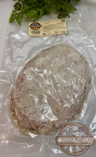 Состав: филе грудки индейки без кожи,сухари панировочные (мука пшеничная хлебопекарная в/с,дрожжи прессованные, растительное масло,сахар,соль),яйцр куриное, молоко ультрапастеризованное, соль каменная илецкая, перец черный молотый,чеснок сухой