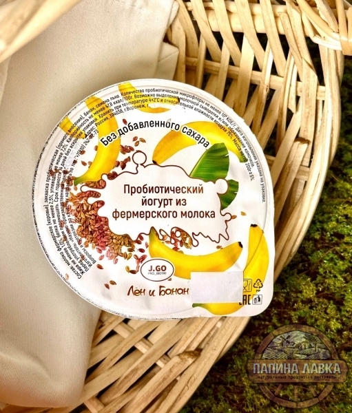 Состав: молоко цельное фермерское (коровье), закваска прямого внесения, банан,семена льна