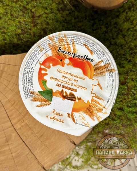 Состав: молоко цельное фермерское (коровье), закваска прямого внесения, смесь растительная 4 злака (овёс, пшеница, рожь, ячмень), конфитюр деликатесный абрикос