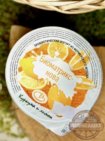 Состав: молоко цельное фермерское (коровье), закваска прямого внесения, конфитюр деликатесный лимон и куркума