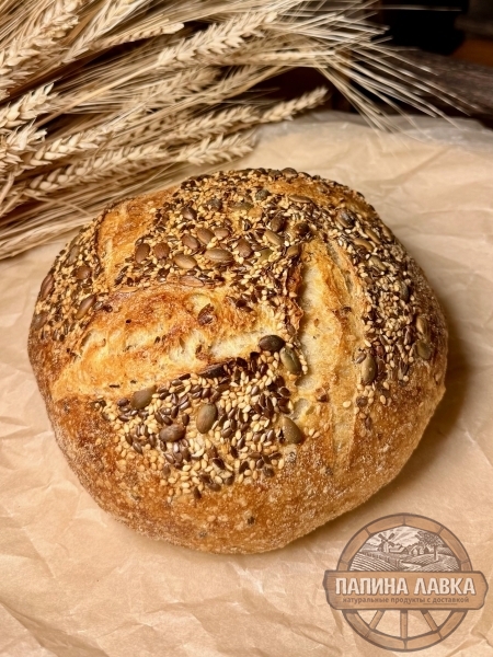 Состав: мука пшеничная в/с казахская,соль,закваска пшеничная ( мука пшеничная в/с шугуровская,вода), вода,семена тыквы,льна, кунжута